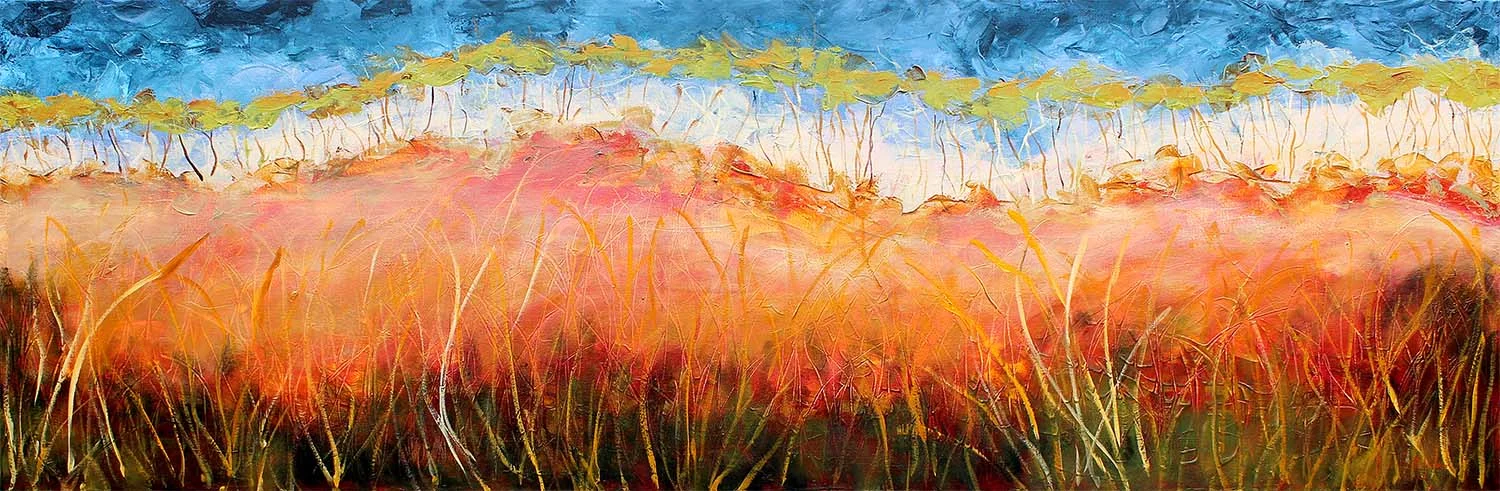 This work , titled "Spirits in The Grass" is a recent favourite. It is medium sized work (76 cm x 112 cm) completed in acrylic paint on canvas.